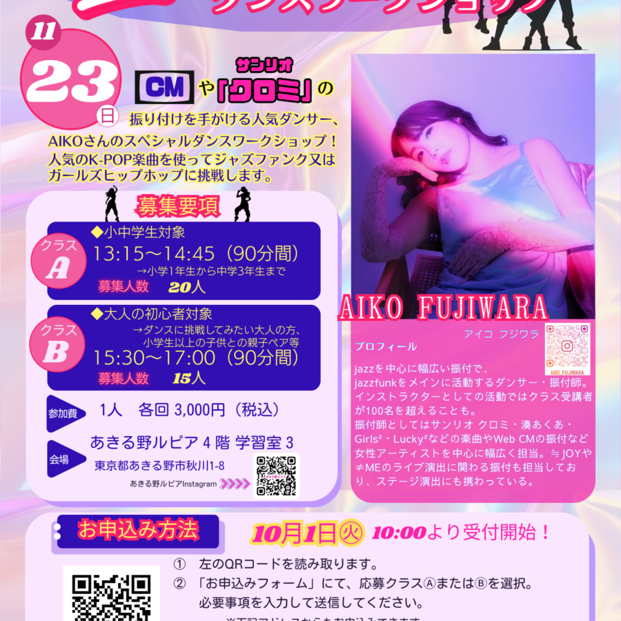 あきる野ルピアにてダンサーAIKO FUJIWARAのダンスワークショップが開催!