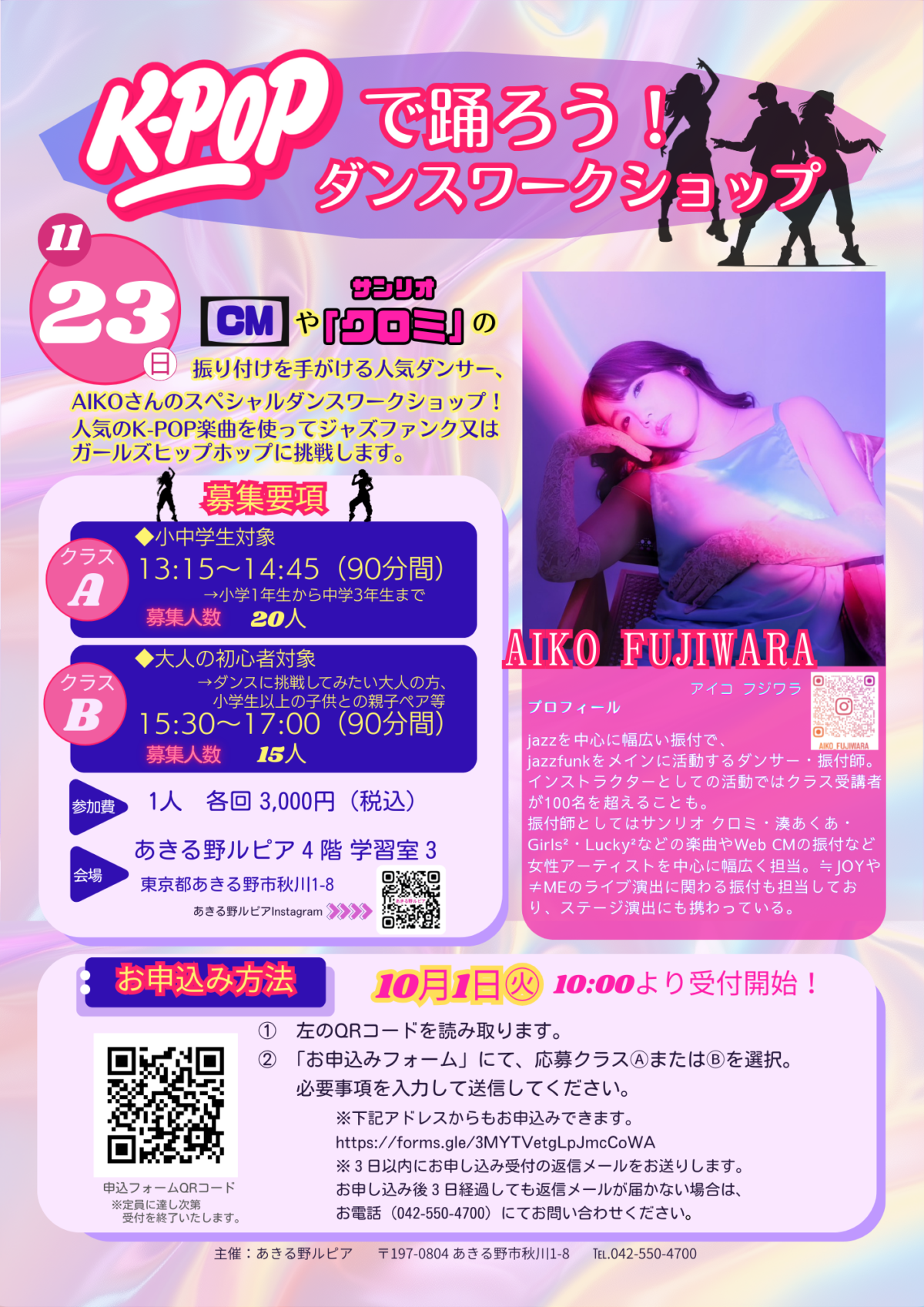 年内ですべてのスタジオのクラスをクローズすると公表したAIKO FUJIWARA。彼女のダンスワークショップはいつも満員御礼の大盛況。そんな人気ダンサーのAIKO FUJIWARAがあきる野ルピアでダンスワークショップを行います。