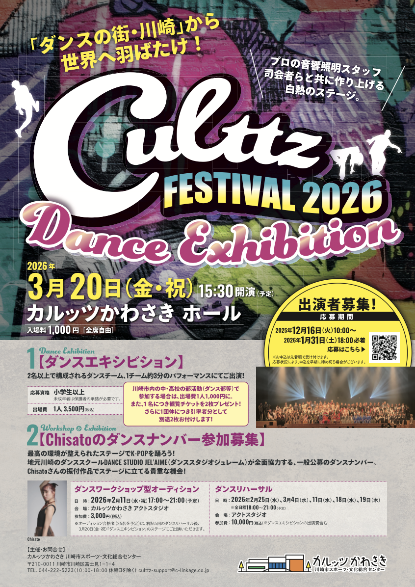 2023年3月の開催から毎年3月に開催されているカルッツかわさきがおくる総合文化祭、Culttz Festival!ホールで行われるダンスエキシビジョンでは、地元川崎の中高のダンス部や、一般公募のダンスチームが中心となって、白熱のステージを披露!出演者を募集中!